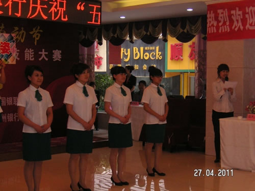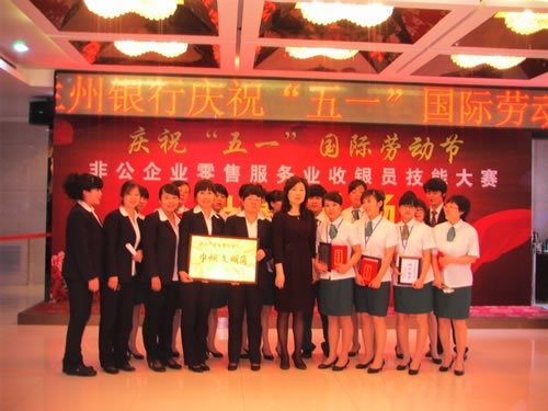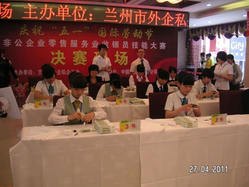 由蘭州市總工會主辦的“非公企業(yè)零售服務(wù)業(yè)收銀員技能比賽” 于2011年4月27日下午,在人民飯店落下帷幕。參加比賽的選手都是來自各公司和企業(yè)的業(yè)務(wù)尖兵,現(xiàn)場壓力重生,但是能和高手同臺競技是挑戰(zhàn),也是幸運(yùn),大家都為榮譽(yù)而奮斗。比賽經(jīng)過單指單張、多指多張、機(jī)器點(diǎn)鈔、銀行卡刷卡、即問即答、工裝展示環(huán)節(jié)近四個(gè)小時(shí)的比拼。最終國芳百貨收銀部取得了驕人的成績,團(tuán)隊(duì)授予“巾幗文明崗”,參賽的12名選手在單項(xiàng)成績中,兩人榮獲得一等獎(jiǎng)、四人榮獲二等獎(jiǎng)、四人榮獲三等獎(jiǎng)、兩人榮獲優(yōu)秀獎(jiǎng)。