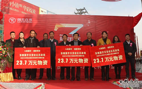 11月22日上午,張掖國芳百貨公司7周年慶典之際,為我區(qū)甘浚鎮(zhèn)光明村、花寨鄉(xiāng)柏楊樹村和平山湖鄉(xiāng)困難群眾一次性捐贈了價(jià)值71萬元的物資。區(qū)委常委、常務(wù)副區(qū)長秦偉、副區(qū)長張興鋒出席了捐贈儀式。