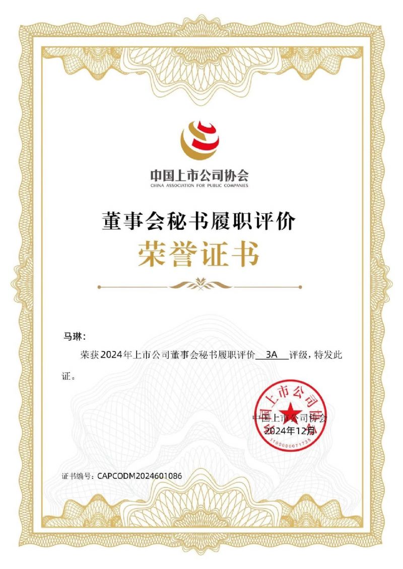 中上協(xié)發(fā)布丨公司榮獲“2024上市公司董事會秘書履職評價(jià)”3A評級
